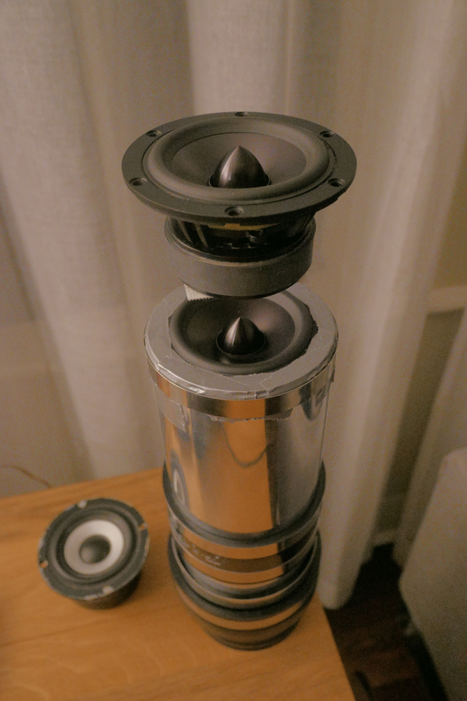Quiver has a carrying strap, recalling the culture of boomboxes and social practices and implications of altering sound in a public environment. It also relates to the DIY audio and Arduino, Raspberry Pi, and other single-board computer communities. The acoustic design creates an "umbrella-like" immersive effect as a result of the omnidirectional sound, horizontally oriented driver, room reflections and interactions. The speaker underwent many iterations in driver selection and enclosure pipe length to achieve a more neutral frequency response given the design constraints of low-cost and portability. By developing this combination of features, we explore the experience design of locative audio. For instance, we experimented with programming GPS change points for downtown Los Angeles that would trigger playback of different Steve Reich's compositions (such as Electric Counterpoint) as one brings the speaker from one location to another. This creates a shared (unlike isolating headphones) acoustical augmented reality where listeners explore the repetitive and ambient nature of navigation through a sleepless city, a flow-space of shifting frequencies and possibilities.
